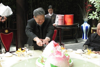 | 2006年寿宴罗老亲手分切寿桃 |