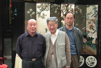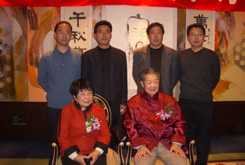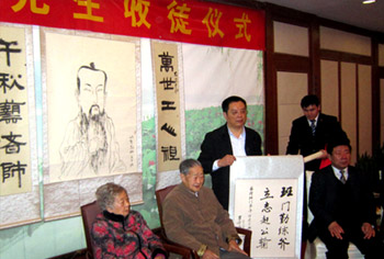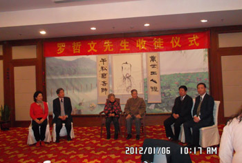 文先生在弟子的簇拥下隆重升座,四个弟子分立两旁。 在主持人的导引下,弟子们分别向罗哲文老师行拜师 礼,师徒间互赠礼物。来自北京、天津、扬州的十二名