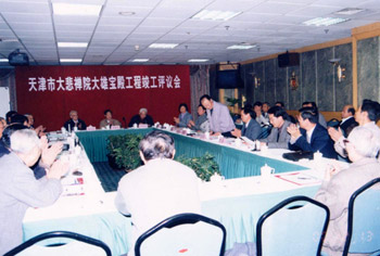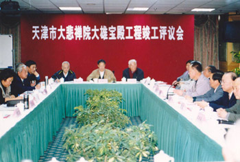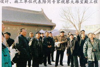 那是2000年11月底,由我主持施工的天津大悲禅院大雄宝殿工程顺利完工。12月12日天津大悲禅院大雄宝殿工程评议会在津召开,师傅和郑孝燮等20多位专家以及天津市的领导出席,大家不顾寒冷,兴致勃勃地参观了大雄宝殿竣工现场。师傅没戴帽子,穿一件浅绿色半大防寒服,胸前挂着照相机,不时拍照,始终面带微笑。
