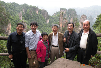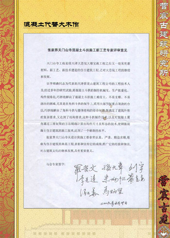 混凝土斗拱在天津西青千佛寺成功运用后,又在湖南张家界天门山寺项目成功运用。2009年5月30日师傅又带领几位专家学者风尘仆仆亲赴张家界现场参观,在评审会上,师傅高度赞扬了混凝土斗拱制作机械化、生产批量化、构件规格化和大部预制重点现浇的工艺技术,是混凝土仿古建筑的施工技术达到了一个展现的水平,是继天津大悲院项目的继续和发展。