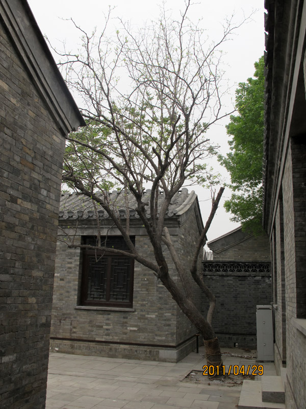 图1532可以看出外檐的板瓦和桶瓦全部采用优质砖瓦,漆画、石雕精美,重现当年的特色。图1536为屋顶瓦面铺设图片。1554为屋脊近景。图1558中我们精心挑选的门钉和抱鼓石。图1570为内跨院。图1581为汉白玉的栏杆。图1588为古镇中古树,施工过程中重点保护。